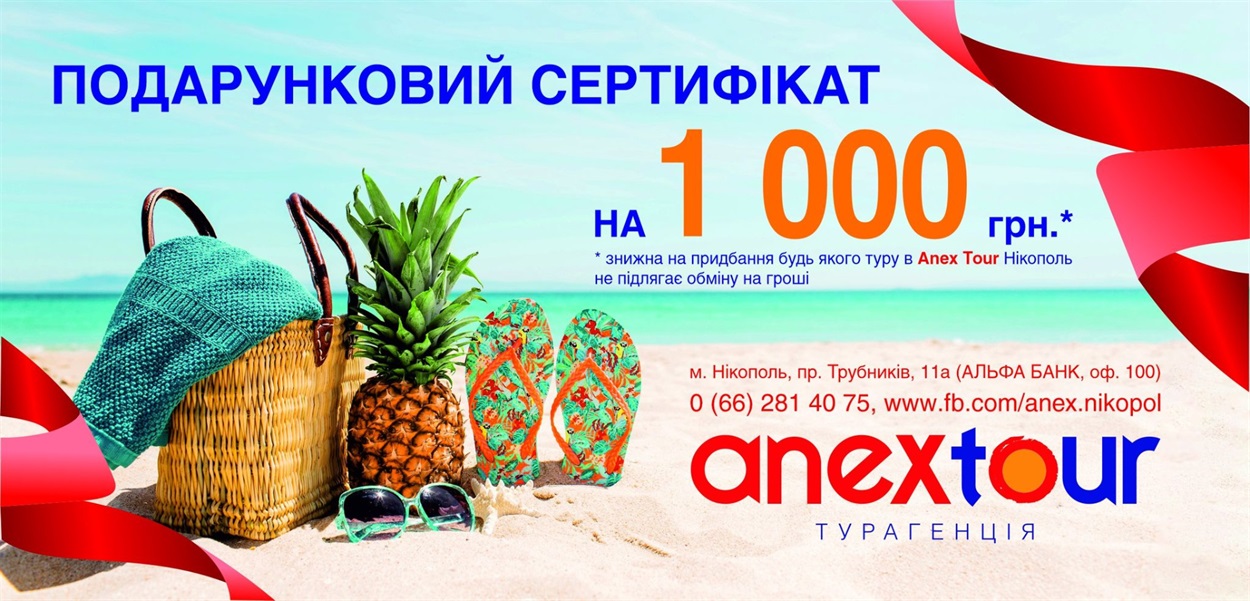 2. Сертификат-скидка на сумму 1000 грн - при заказе зарубежного отдыха в «Anex Tour» Никополь от туристического агентства «Anex Tour».